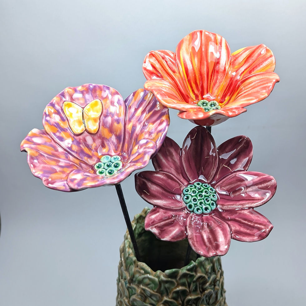 3 Ceramic Flowers Orange, Red, Maroon with Butterfly decoration